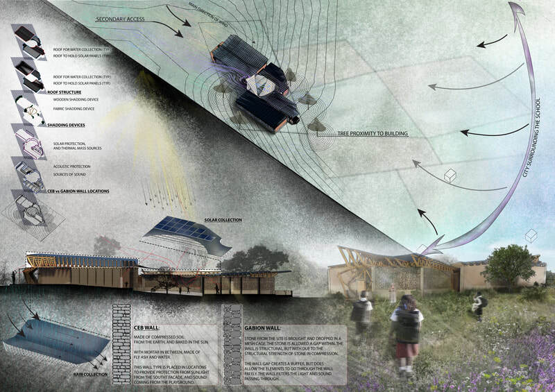 Level 1: The school is locate between to residential areas, and is oriented to to be accessible when coming from either city. The location of the buildings created a safe space in the middle of the building for the kindergartners to play in during their break. Based on the location of the playground, a mix of brick and gabion walls are strategically placed to provide privacy, yet allowing wind to cool down the building naturally. In addition to that, one of the roofs is design with water collection in mind filtering the water through a charcoal filter and storing it in a location that would leave it cool. The other roofs have solar panels to store energy. With these systems in place the building is the building has the ability to stay off grid.